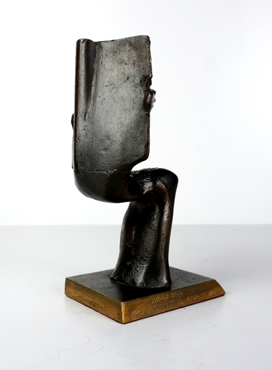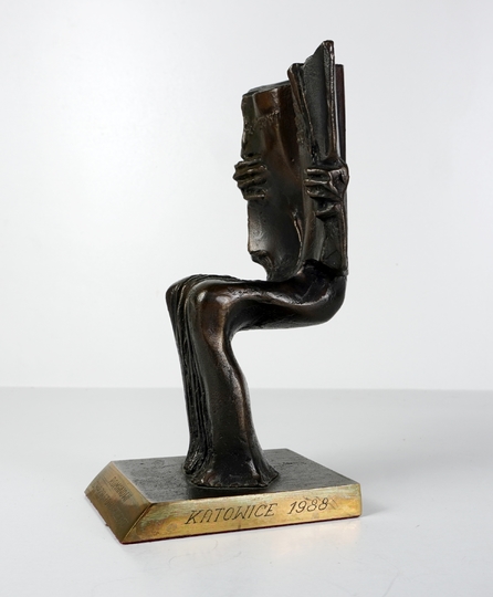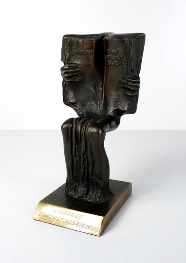 [MIŁOŚNIK książek]. Nagroda w formie odlanej w brązie figury z napisem "Człowiekowi, który umiłował książkę". 1988.