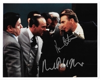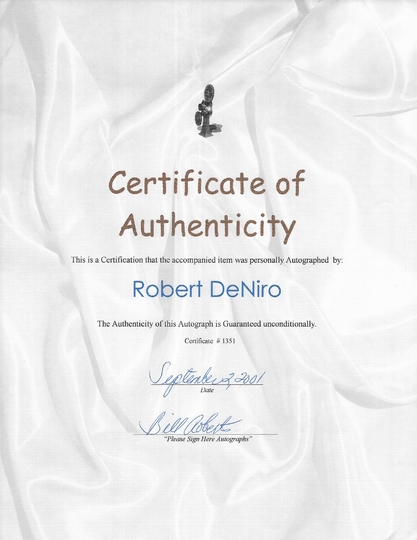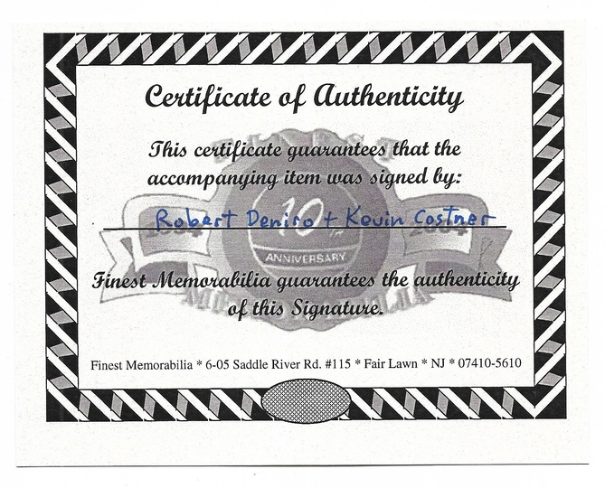 [DE NIRO Robert, COSTNER Kevin]. Podpisy Roberta De Niro i Kevina Costnera na wspólnej barwnej fotografii z filmu "Nietykalni" z 1987.