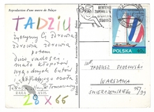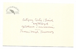 [TOMASZEWSKI Henryk]. Karta pocztowa z odręcznymi życzeniami imieninowymi składanymi przez Henryka Tomaszewskiego w imieniu swoim i żony, Teresy Pągowskiej, dat. 28 X 1966.