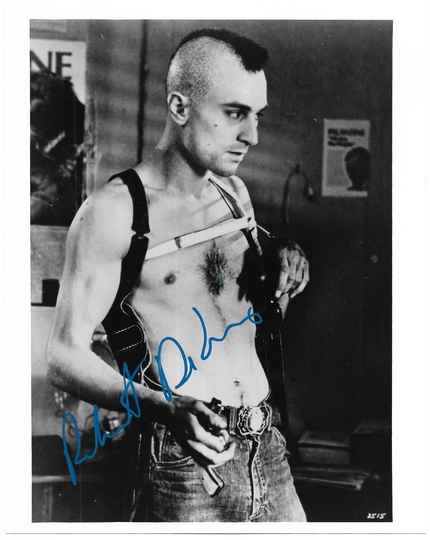 [DE NIRO Robert]. Odręczny Podpis Roberta De Niro na czarno-białej fotografii będącej kadrem z filmu "Taksówkarz".