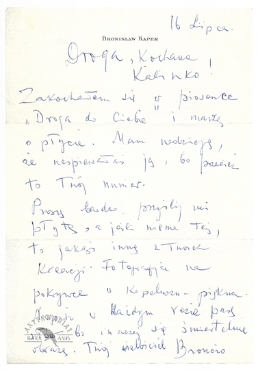 [KAPER Bronisław, JĘDRUSIK Kalina]. Odręczny list Bronisława Kapera do Kaliny Jędrusik z ok. 1966.