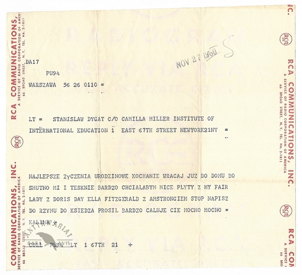 [JĘDRUSIK Kalina, DYGAT Stanisław]. Telegram wysłany przez Kalinę Jędrusik w Warszawie do Stanisława Dygata w Nowym Jorku dn. 27 XI 1960.