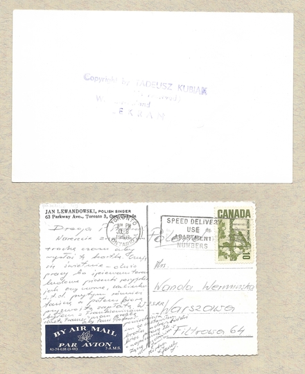 [LEWANDOWSKI (LEWAN) Jan]. Odręczna dedykacja na zdjęciu oraz pocztówka Jana Lewandowskiego z korespondencją do Wandy Wermińskiej w Warszawie, wysłana 8 VII 1968 z Toronto.