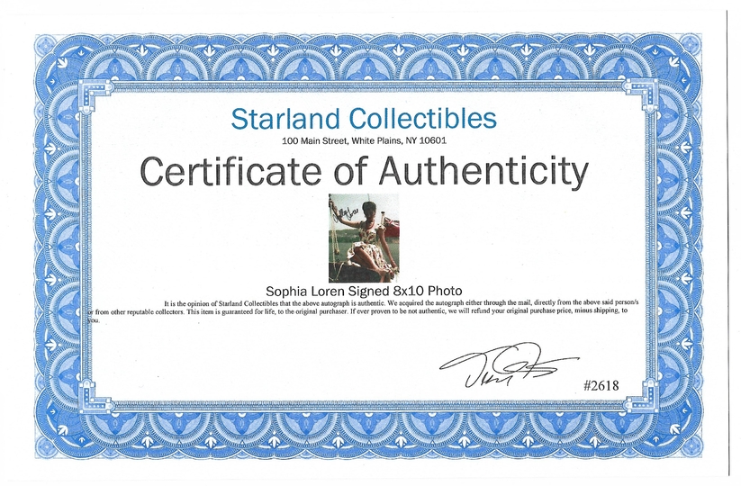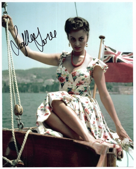 [LOREN Sophia]. Autograf Sophii Loren na jej barwnej fotografii wykonanej ok. 1957.