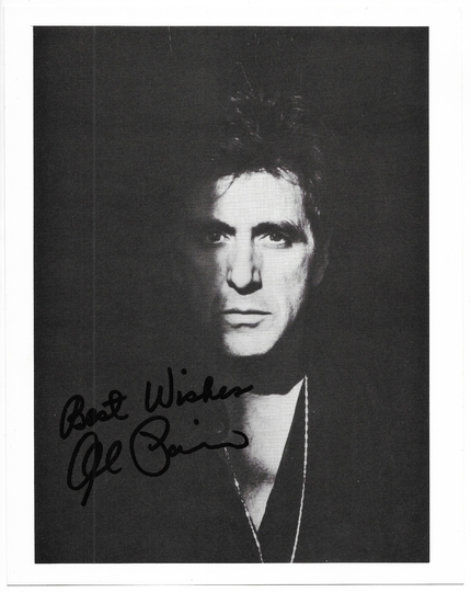 [PACINO Al]. Krótka dedykacja i podpis Ala Pacino na czarno-białej fotografii portretowej.