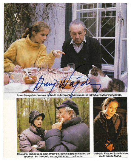 [WAJDA Andrzej]. Podpis Andrzeja Wajdy na barwnej fotografii wyciętej z francuskojęzycznego czasopisma.