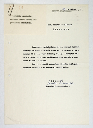 [IWASZKIEWICZ Jarosław]. Maszynopisowy list Jarosława Iwaszkiewicza z jego odręcznym podpisem, jako prezesa Związku Literatów Polskich do Tadeusza Łopalewskiego, datowany 29 IX 1977 w Warszawie.