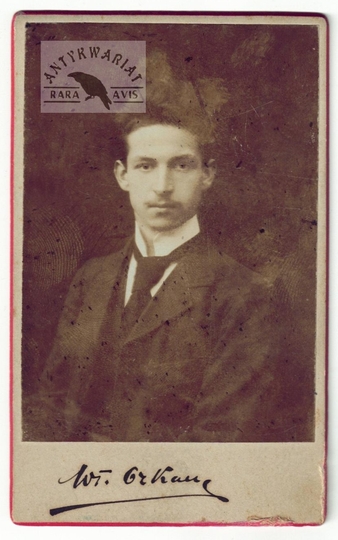 [ORKAN Władysław]. Podpis Władysława Orkana pod zdjęciem i jego odręczna dedykacja na odwrocie.