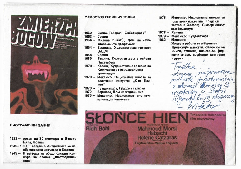 [GÓRKA Wiktor]. Odręczna dedykacja Wiktora Górki dla niewymienionego z nazwiska Tadeusza Jodłowskiego na katalogu wystawy prac prezentowanej w Sofii w 1987.