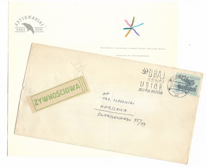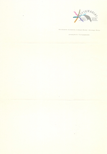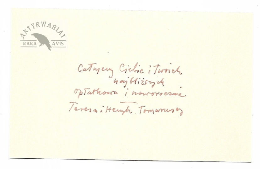 [TOMASZEWSKI Henryk]. Odręczne życzenia świąteczno-noworoczne Henryka Tomaszewskiego w imieniu własnym i żony Teresy Pągowskiej dla niewymienionego z nazwiska Tadeusza Jodłowskiego, ilustratora i twórcy plakatów z końca 1981.