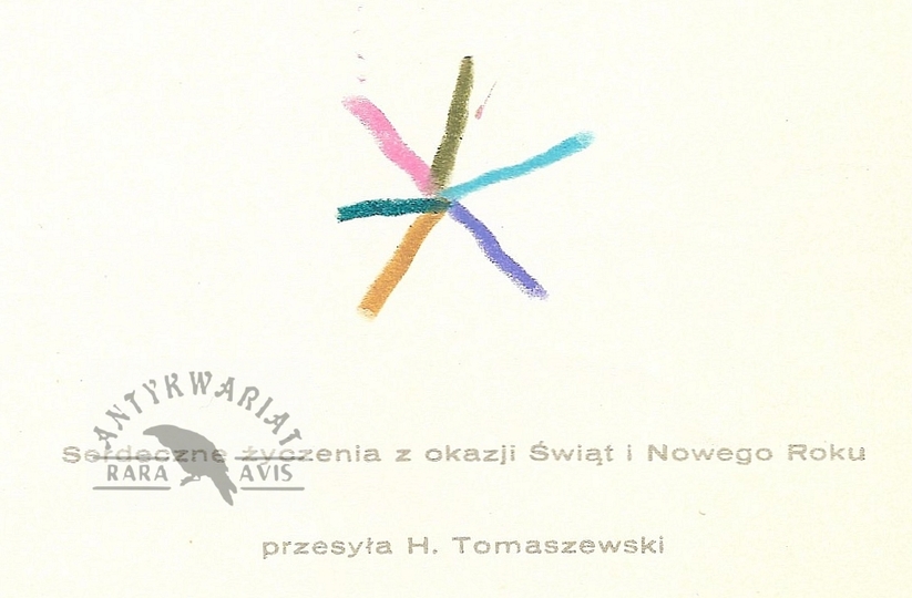 [TOMASZEWSKI Henryk]. Życzenia świąteczno-noworoczne (wydrukowane) Henryka Tomaszewskiego dla ilustratora i twórcy plakatów Tadeusza Jodłowskiego, ozdobione odręcznie wykonaną kolorową gwiazdką. 1964?