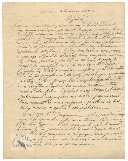 [DUTKIEWICZ Szymon]. Odręczny list Szymona Dutkiewicza do niewymienionego z nazwiska przyjaciela, dat. 1 IV 1829 w Krakowie.