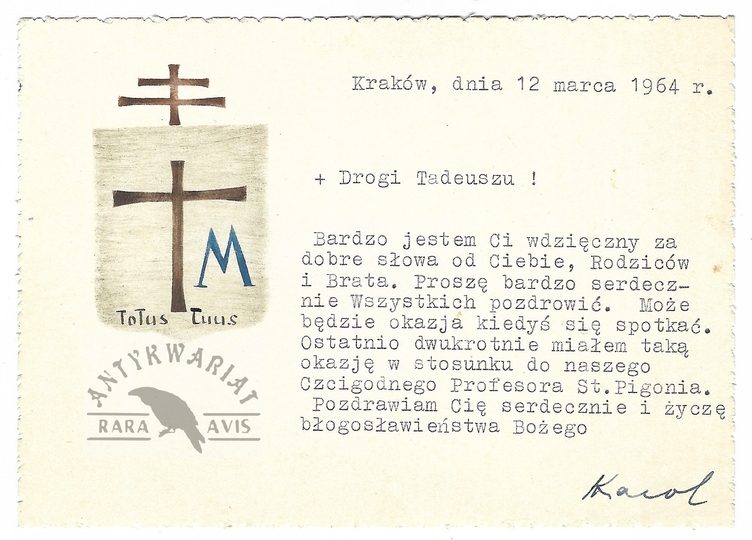 [WOJTYŁA Karol]. Maszynopisowy list kardynała Karola Wojtyły z jego odręcznym podpisem do nieznanego adresata, dat. 12 III 1964 w Krakowie.