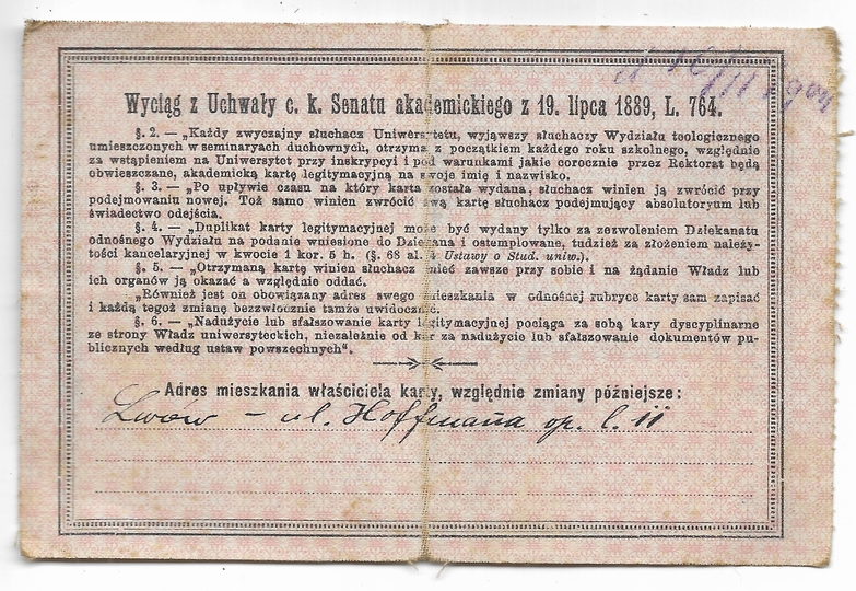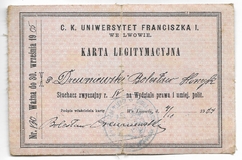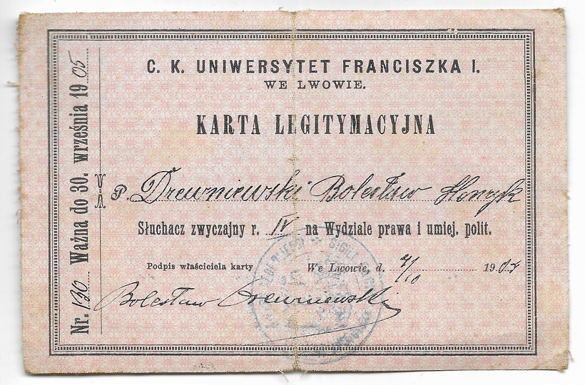 KARTA legitymacyjna. C. k. Uniwersytet Franciszka I. we Lwowie. Dokument wydany Bolesławowi Drewniewskiemu, słuchaczowi czwartego roku Wydz. prawa i umiejętności politycznych, dn. 4 X 1904.