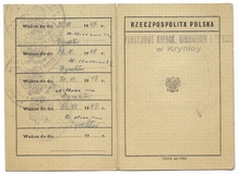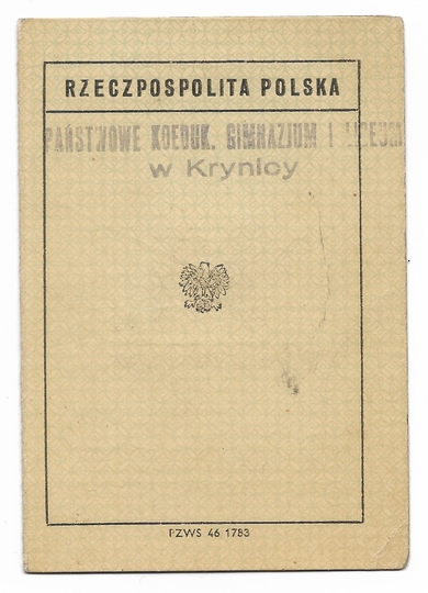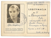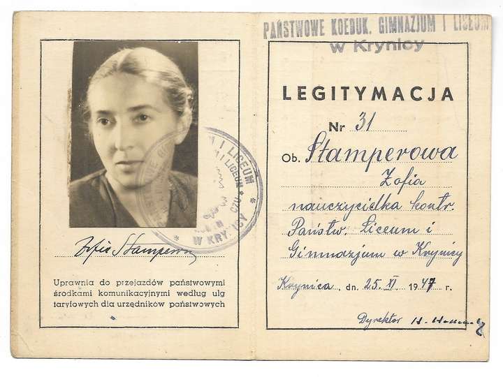 LEGITYMACJA. Państwowe Koedukacyjne Gimnazjum i Liceum w Krynicy. Dokument wydany Zofii Stamperowej, nauczycielce kontraktowej, dn. 25 XI 1947.