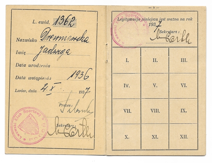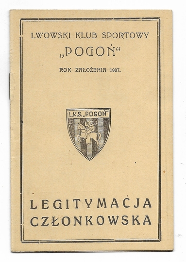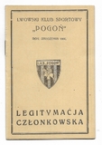 LEGITYMACJA członkowska. Lwowski Klub Sportowy "Pogoń". Rok założenia 1907. Legitymacja Jadwigi Drewniewskiej, zawodniczki "Pogoni" od 1936, wystawiona dn. 4 X 1937 we Lwowie.