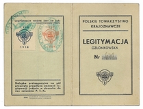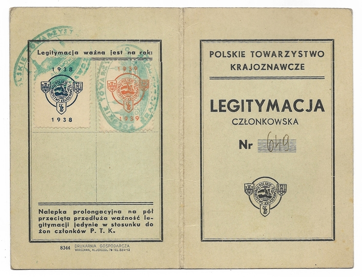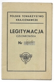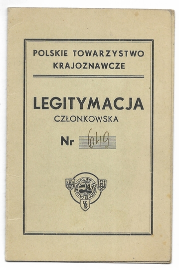 LEGITYMACJA członkowska. Polskie Towarzystwo Krajoznawcze. Dokument wydany Bolesławowi Drewniewskiego dn. 31 VIII 1938 we Lwowie.