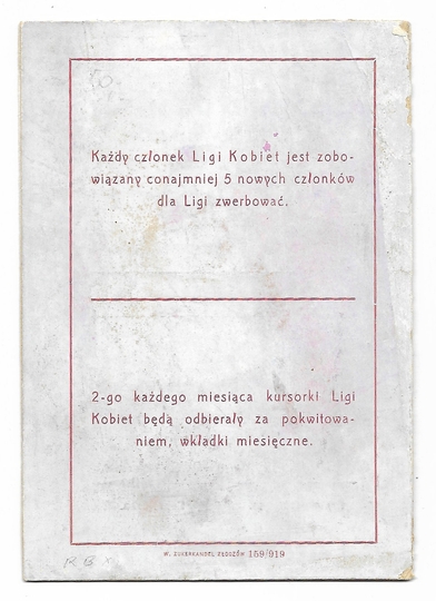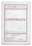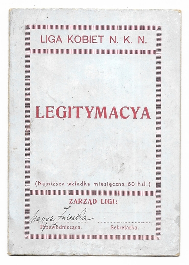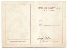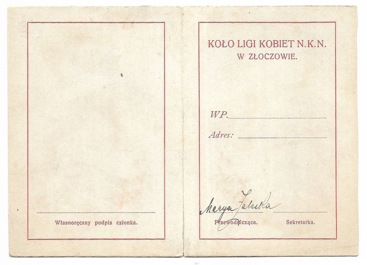 LEGITYMACYA. Liga Kobiet N.K.N., Koło w Złoczowie. Niewypełniony blankiet legitymacyjny dwukrotnie podpisany przez Marię Zaleską, przewodniczącą Koła.