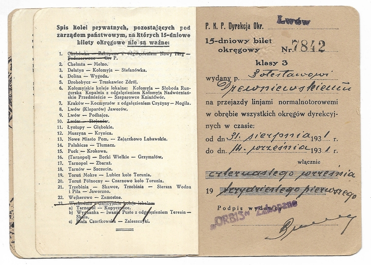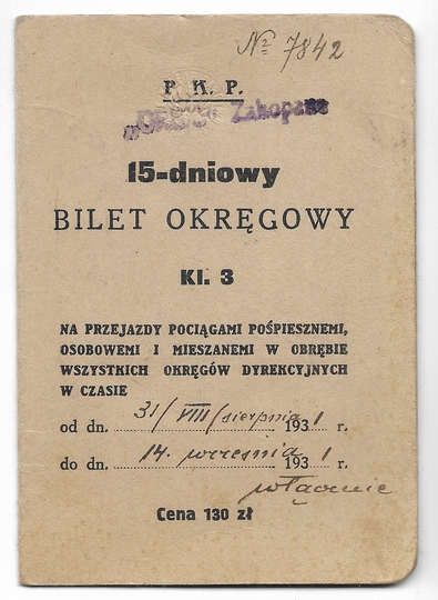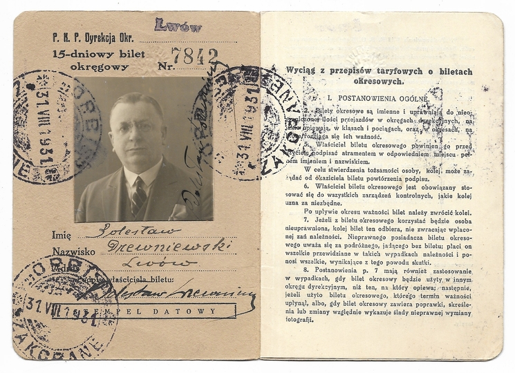 [BILET]. 15-DNIOWY bilet okręgowy kl. 3 na przejazdy pociągami pośpiesznymi i mieszanemi [...]. Polskie Koleje Państwowe. Bilet imienny dla Bolesława Drewniewskiego, ważny od 31 VIII 1931 do 14 IX 1931.