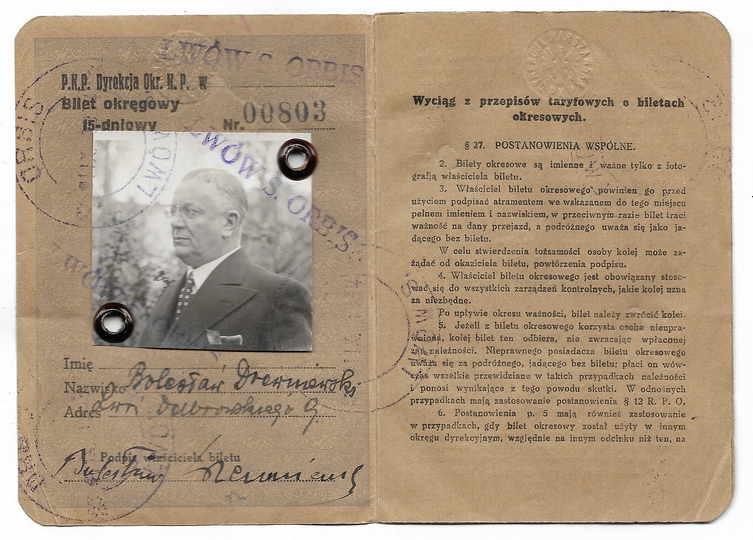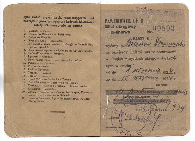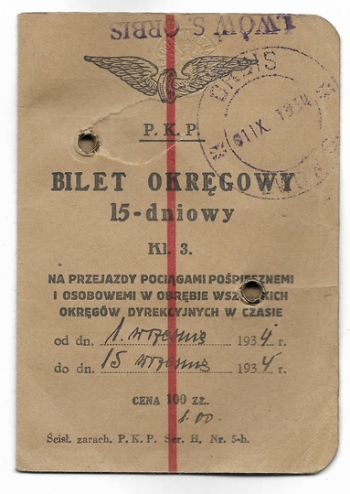 [BILET]. BILET okręgowy 15-dniowy kl. 3 na przejazdy pociągami pośpiesznymi i osobowemi [...]. Polskie Koleje Państwowe. Bilet imienny dla Bolesława Drewniewskiego, ważny od 1 IX 1934 do 15 IX 1934.