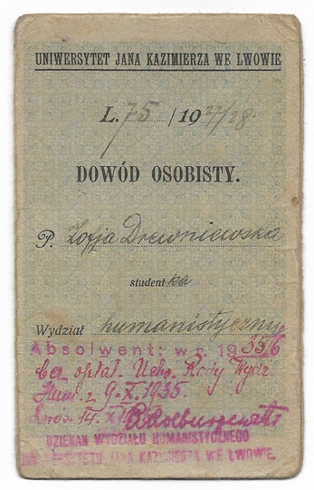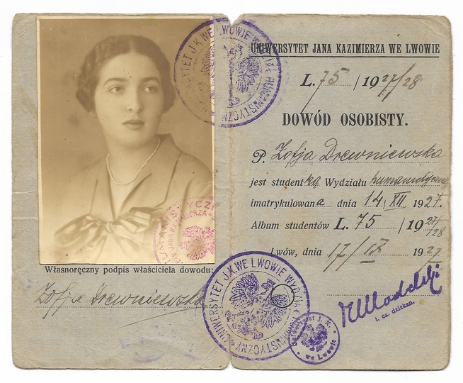 DOWÓD osobisty. Uniwersytet Jana Kazimierza we Lwowie. Dokument wystawiony Zofii Drewniewskiej, studentce Wydziału humanistycznego dn. 17/IX 1927 we Lwowie.