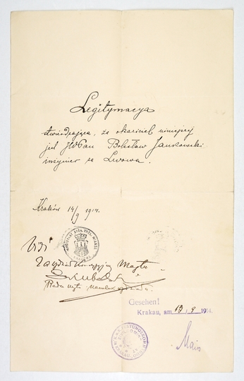 [DOWÓD tożsamości]. Odręcznie sporządzony dokument treści: "Legitymacya strwierdzająca, że okaziciel niniejszej jest JWPan Bolesław Jankowski inżynier ze Lwowa" dn. 14 IX 1914 w Krakowie.