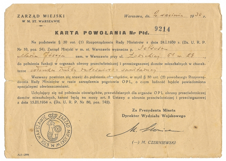 KARTA powołania wystawiona Marii J. Selsowej potwierdzająca wyznaczenie jej do pełnienia funkcji w organach obrony przeciwlotniczej i przeciwgazowej, dn. 2 IX 1939 w Warszawie.