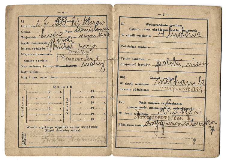 LEGITYMACJA Przysposobienia Wojskowego wydana junakowi Julianowi Cygankowi 1 VI 1948 w Miechowie.