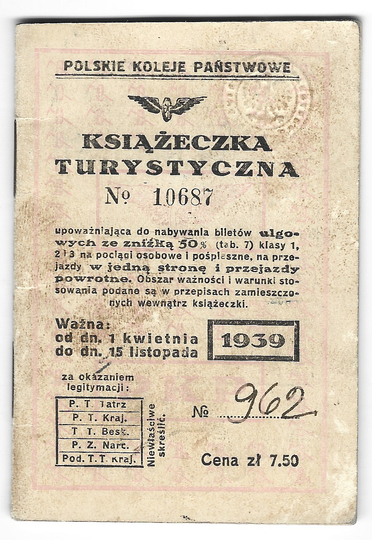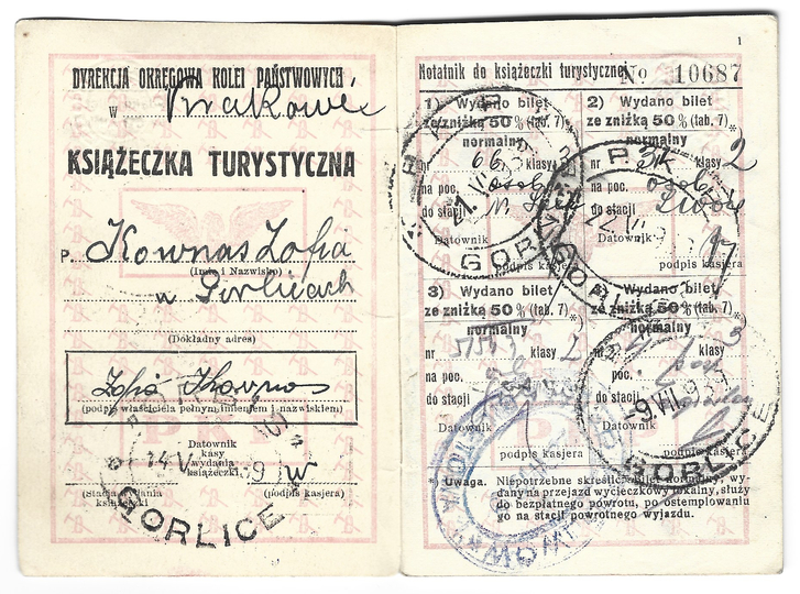 KSIĄŻECZKA turystyczna wydana przez Polskie Koleje Państwowe Zofii Kownas z Gorlic dn. 14 V 1939.