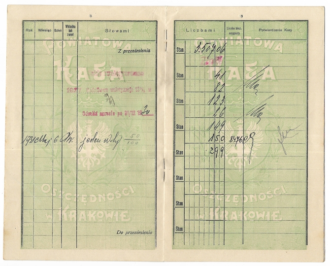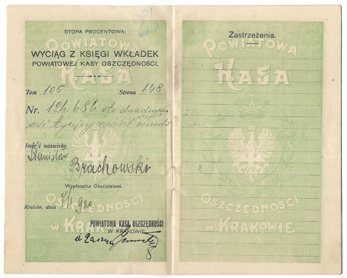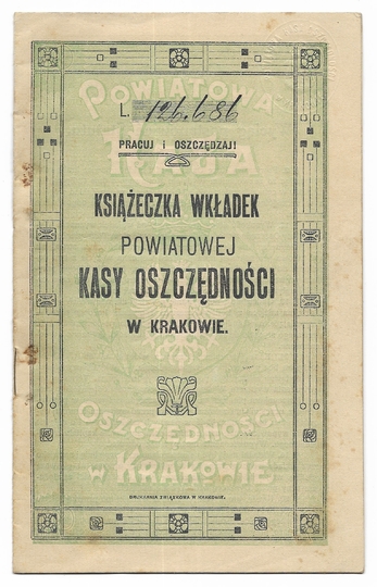 KSIĄŻECZKA wkładek Powiatowej Kasy Oszczędności w Krakowie Stanisława Brachowskiego, założona 7 I 1920 w Krakowie.