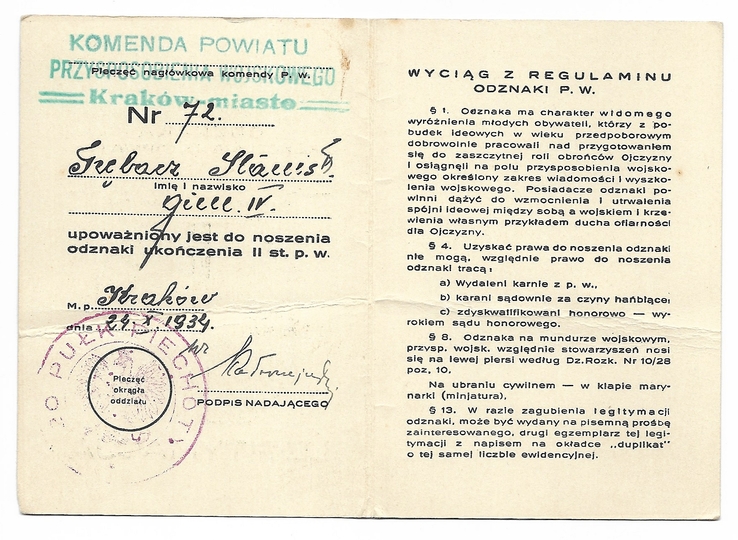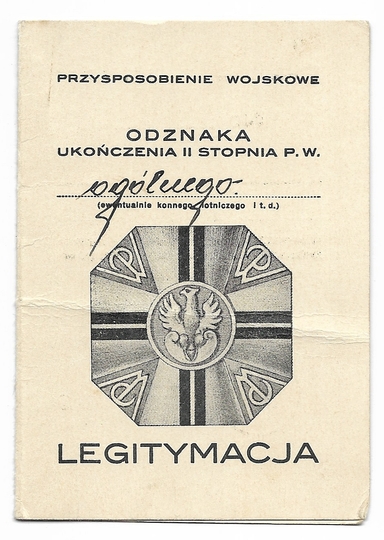 LEGITYMACJA odznaki ukończenia II stopnia przysposobienia wojskowego ogólnego przyznanej Stanisławowi Trębaczowi w Krakowie dn. 24 X 1934.