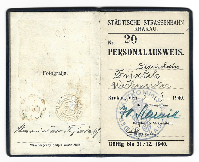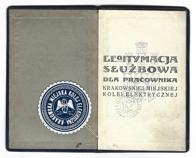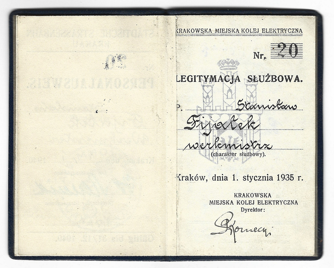 LEGITYMACJA służbowa dla pracownika Krakowskiej Miejskiej Kolei Elektrycznej wydana werkmistrzowi Stanisławowi Fijałkowi dn. 1 I 1935 w Krakowie.
