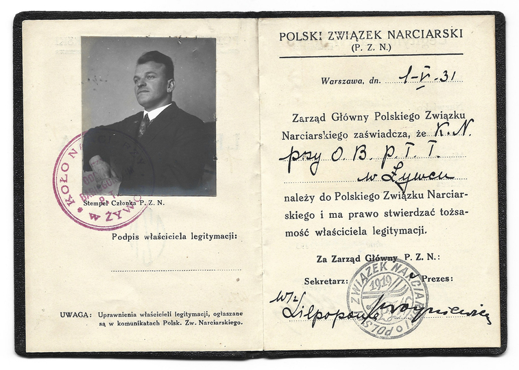 LEGITYMACJA Polskiego Związku Narciarskiego Władysława Jaworskiego z Krakowa wystawiona w Żywcu 22 XII 1931.