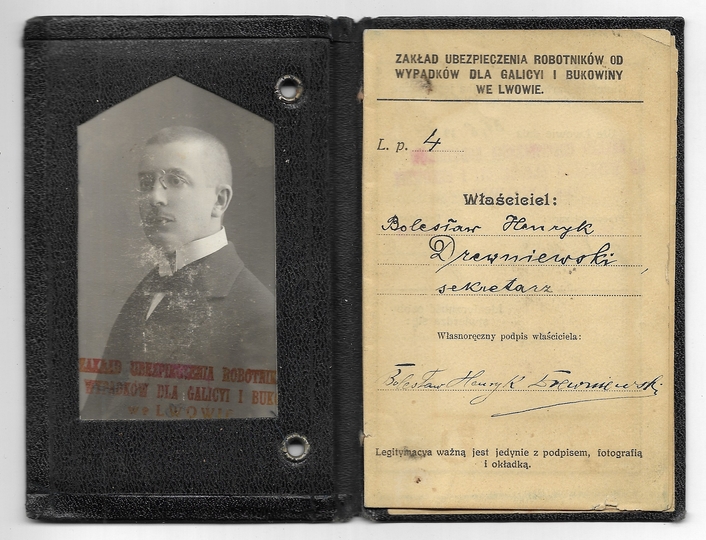 LEGITYMACYA. Zakład Ubezpieczenia Robotników od Wypadków dla Galicyi i Bukowiny we Lwowie. Dokument wystawiony Bolesławowi Drewniewskiemu, sekretarzowi, dn. 31 VIII 1914 we Lwowie.