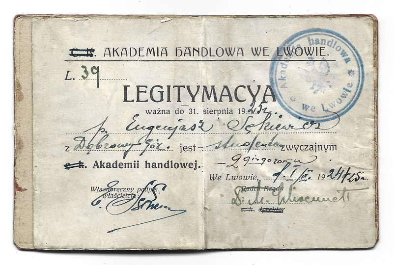 LEGITYMACYA Akademii Handlowej we Lwowie, wydana studentowi 2. roku Eugeniuszowi Sękiewiczowi z Dąbrowy Górniczej na rok akademicki 1924/1925.