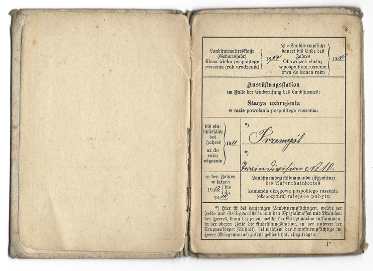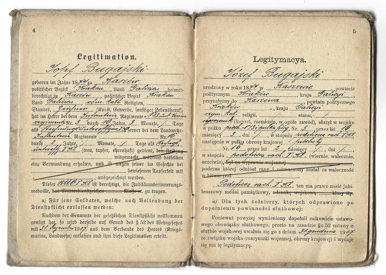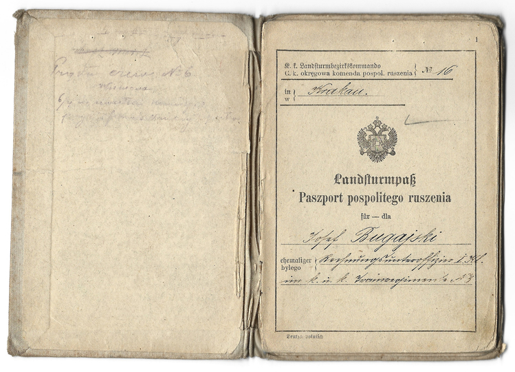 PASZPORT pospolitego ruszenia wydany Józefowi Bugajskiemu z Kaszowa dn. 1 I 1908 w Krakowie.