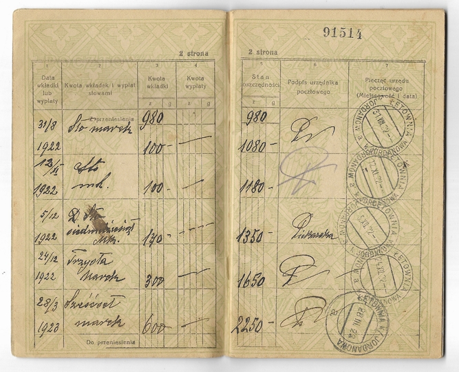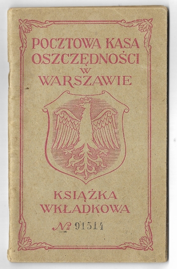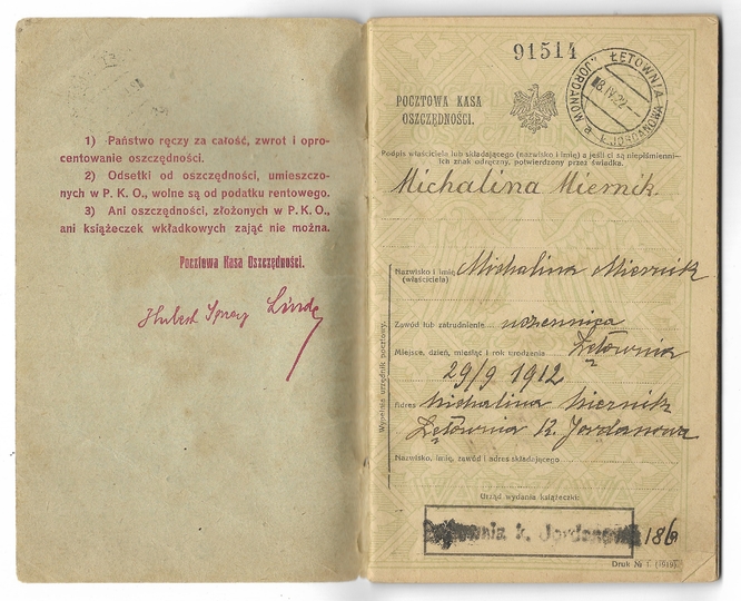 POCZTOWA Kasa Oszczędności w Warszawie. Książeczka wkładkowa Michaliny Miernik z Łętowni k. Jarosławia założona w 1922.