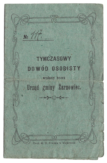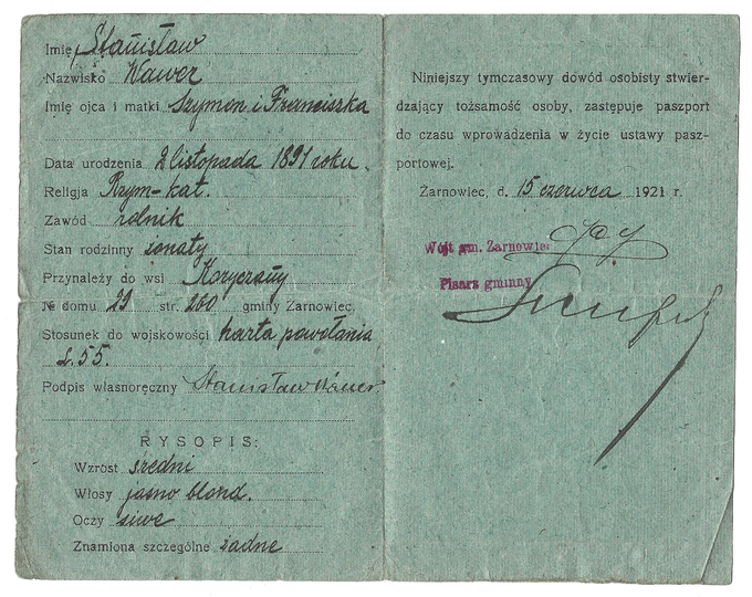 TYMCZASOWY dowód osobisty wydany przez Urząd gminy Żarnowiec Stanisławowi Wawerowi dn. 15 VI 1921.