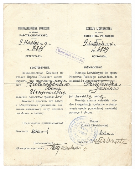 ZAŚWIADCZENIE Komisji Likwidacyjnej do spraw Królestwa Polskiego potwierdzające, że Janina Pawłowska jest obywatelką polską, dat. 9 XI 1917 w Piotrogrodzie.