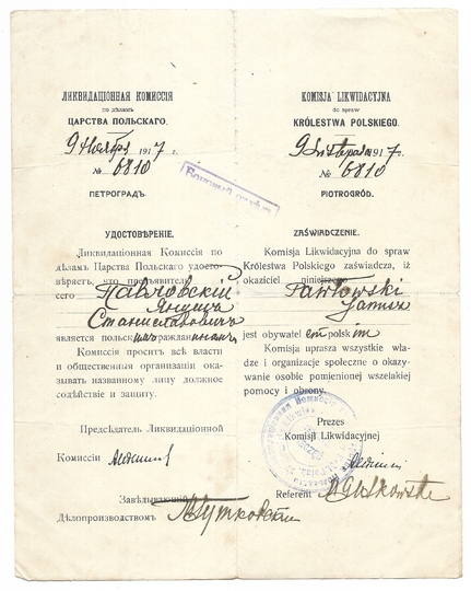 ZAŚWIADCZENIE Komisji Likwidacyjnej do spraw Królestwa Polskiego potwierdzające, że Janusz Pawłowski jest obywatelem polskim, dat. 9 XI 1917 w Piotrogrodzie.