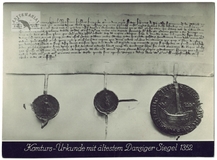 [GDAŃSK - zdjęcie dokumentu komturiańskiego z najstarszą gdańską pieczęcią z 1352 roku - fotografia prasowa]. [l. 30. XX w.]. Fotografia form. 11,6x15,8 cm.