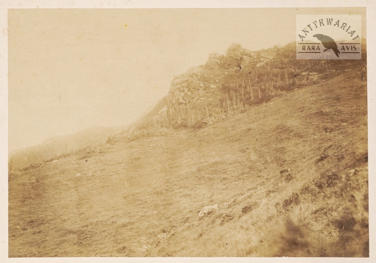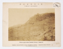 [GÓRY - Karpaty Wschodnie - Pokucie - widok na górę zwaną Krzesłem Dobosza w Dzembroni - fotografia widokowa - ujęcie w dużym formacie]. [1880]. Fotografia form. 16,5x23,9 cm na oryg. podkładzie form. 22,5x30 cm, autorstwa J[uliusza] Dutkiewicza w Kołomyi.