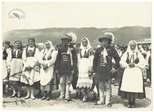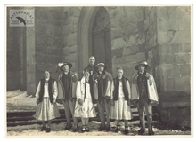 [GÓRY - Karpaty - Tatry - przed kościołem w Chochołowie - fotografia zbiorowa, pozowana]. 1937. Fotografia form. ca 12x17 cm, autorstwa Władysława Wachulskiego z Chochołowa.