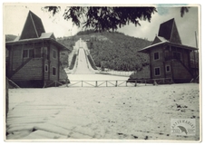 [GÓRY - Karpaty - Tatry - Wielka Skocznia na Krokwi w Zakopanem - fotografia widokowa]. [1938?]. Fotografia form. 12,2x17,6 cm, autorstwa [Henryka] Schabenbecka w Zakopanem.