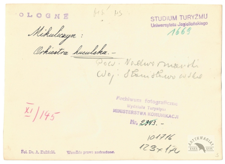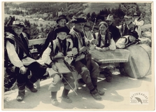 [HUCULSZCZYZNA - Mikuliczyn - orkiestra huculska - fotografia sytuacyjna, pozowana]. [l. 30. XX w.]. Fotografia form. 12,6x17,5 cm, autorstwa A[dama] Zielińskiego.