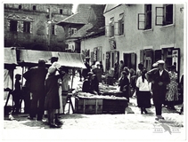 [I WOJNA św. - targ z Hucułami na rynku w Czerniowcach - fotografia prasowa, sytuacyjna]. [1914/1918]. Fotografia form. ca 13x18 cm, nieznanego autorstwa.