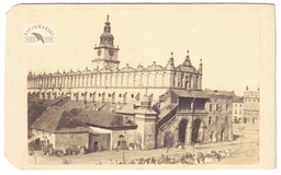 [KRAKÓW - Sukiennice i Kramy Bogate od południowego wschodu - fotografia widokowa - ujęcie w formacie card de visite]. [koniec 1867]. Fotografia form. 5,7x8,5 cm na oryg. podkładzie form. 6,1x9,9 cm, autorstwa zapewne [J[gnacego] Kriegera w Krakowie].