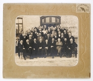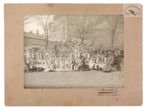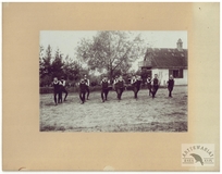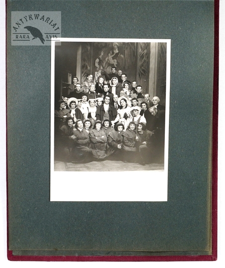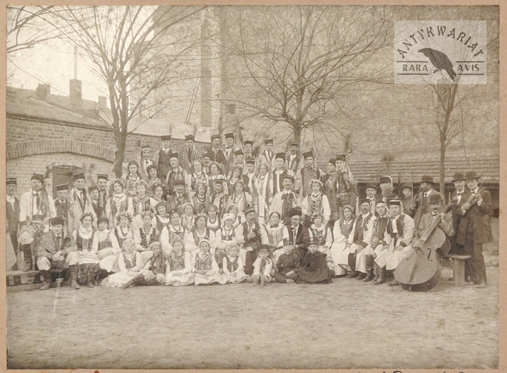 [KRAKÓW - krakowskie wesele - fotografia zbiorowa]. [1. poł. XX w.]. Fotografia form. 17x23 cm, na oryg. podkładzie form. 24x32 cm, autorstwa Józefa Bryniarskiego w Krakowie.