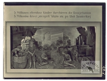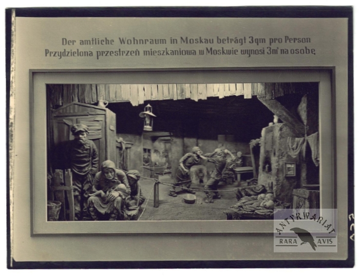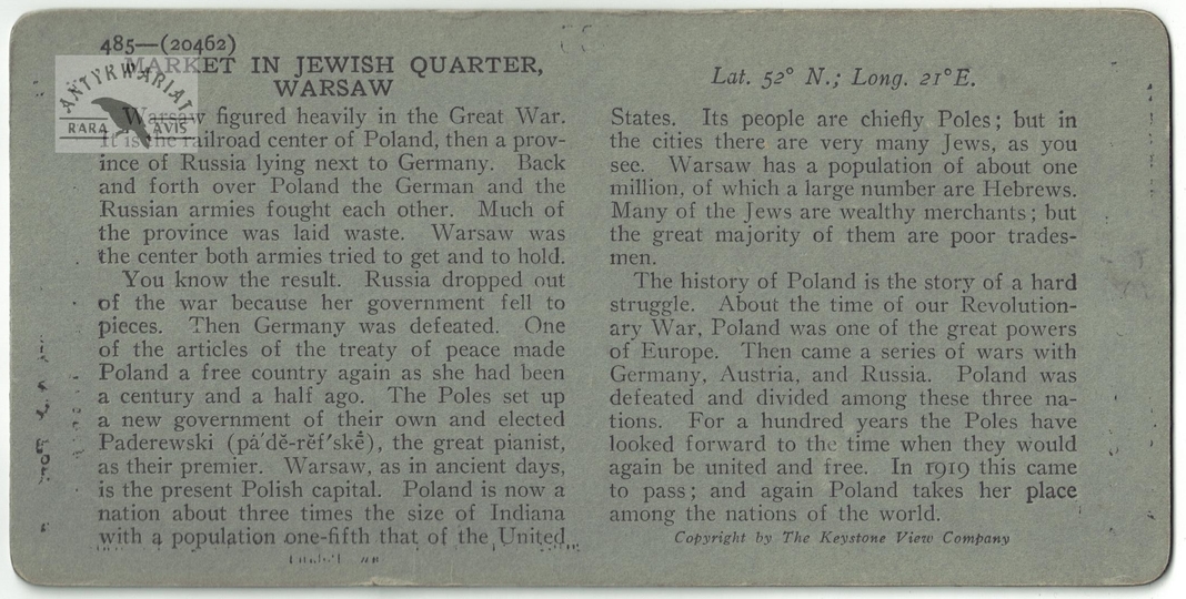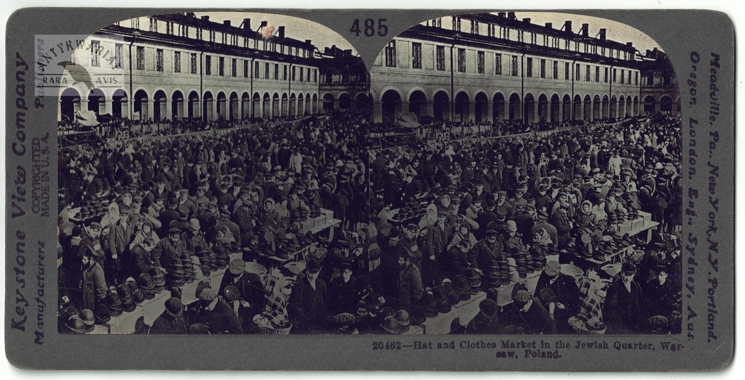 [WARSZAWA - targ ubrań i kapeluszy w dzielnicy żydowskiej - fotografia sytuacyjna, widokowa - stereoskopowa]. [ok. 1919]. Fotografia form. 7,7x7,7 cm razy dwa na oryg. podkładzie form. 8,9x17,8 cm, wykonana przez Keystone View Company.