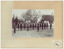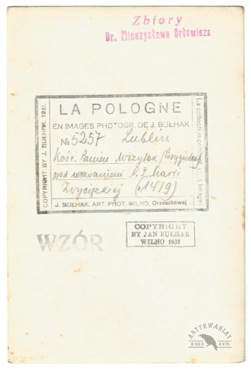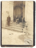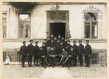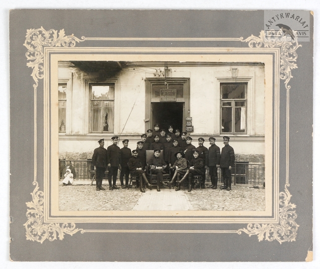 [WILNO - przed budynkiem IV Komisariatu Milicji Miejskiej - fotografia pozowana, sytuacyjna]. [nie przed IV 1919, nie po VIII 1920]. Fotografia form. 12x16,6 cm na podkładzie form. ca 20x24,5 cm.